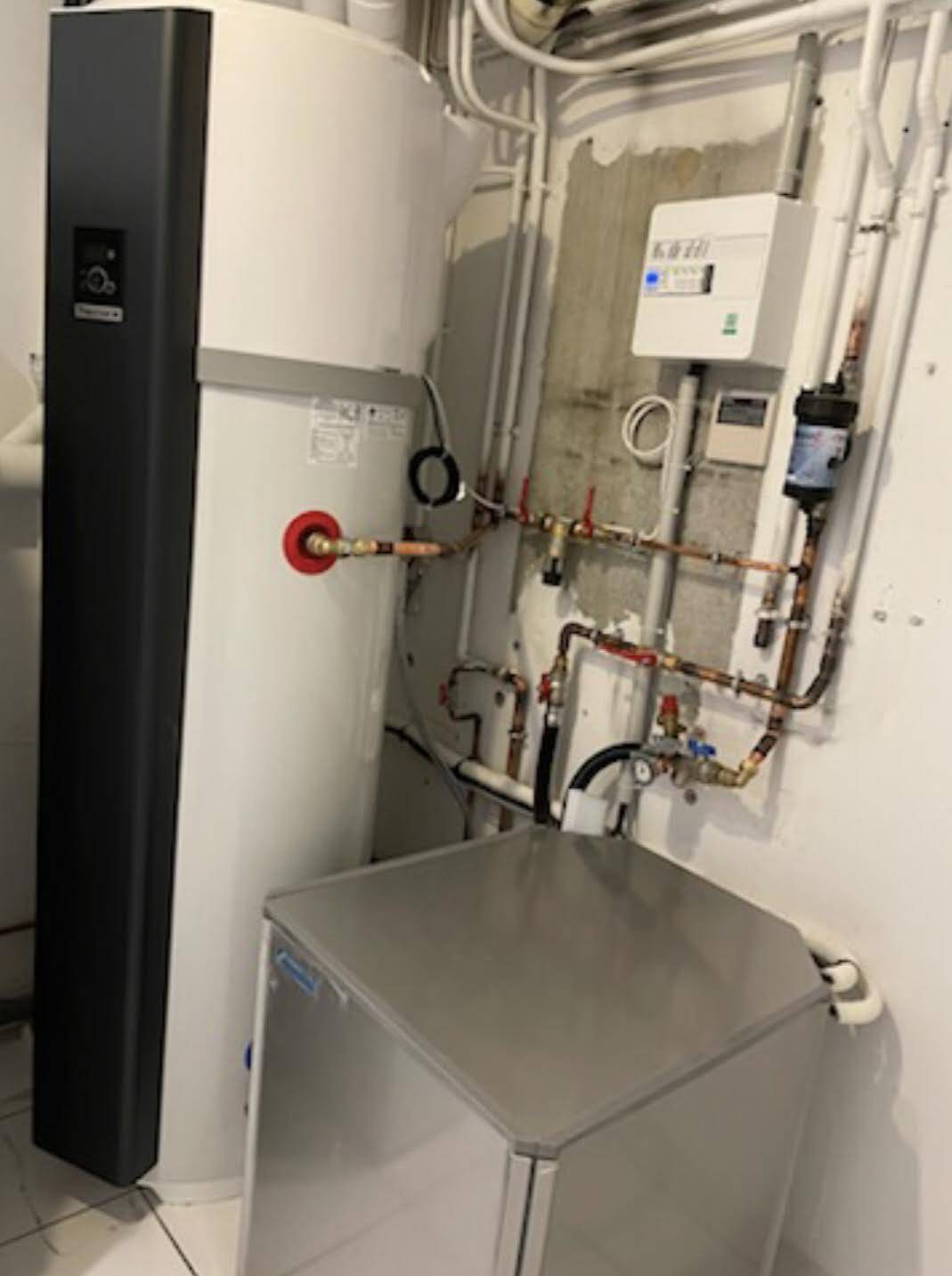 Installation d'une pompe à chaleur Air/Eau sur Léognan en remplacement d'une chaudière gaz avec un ballon Styx à gaz .