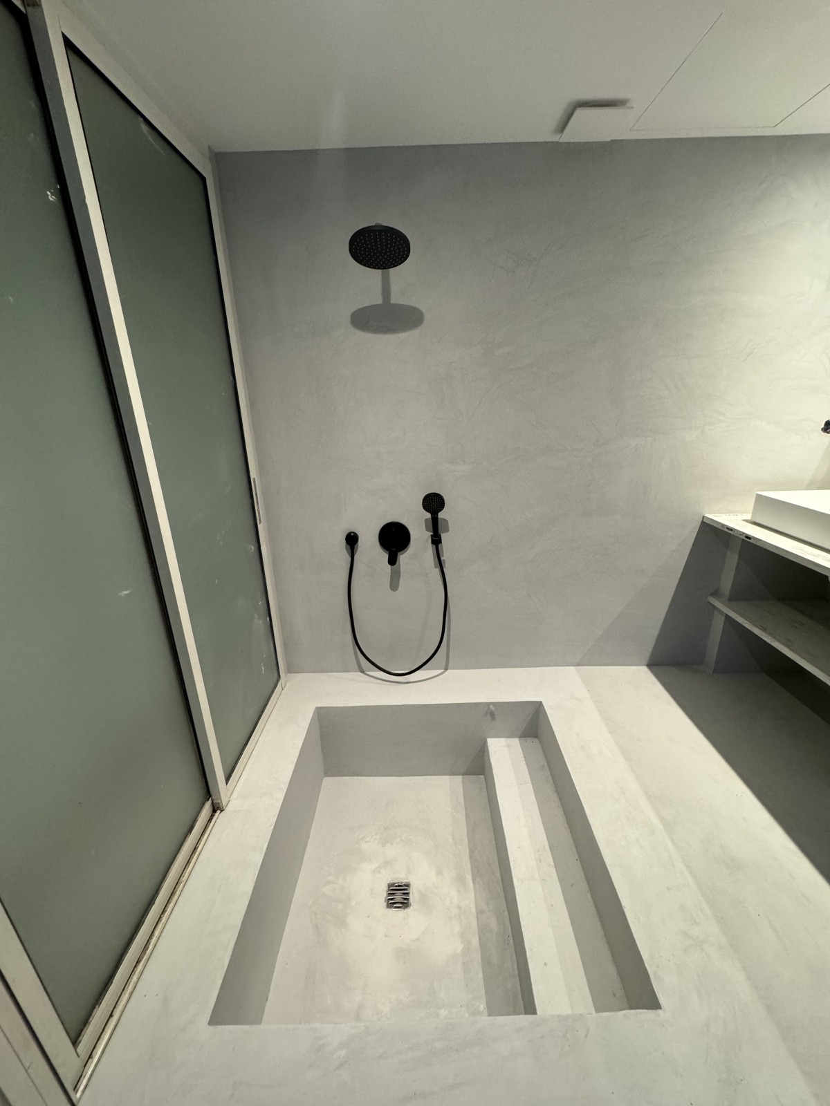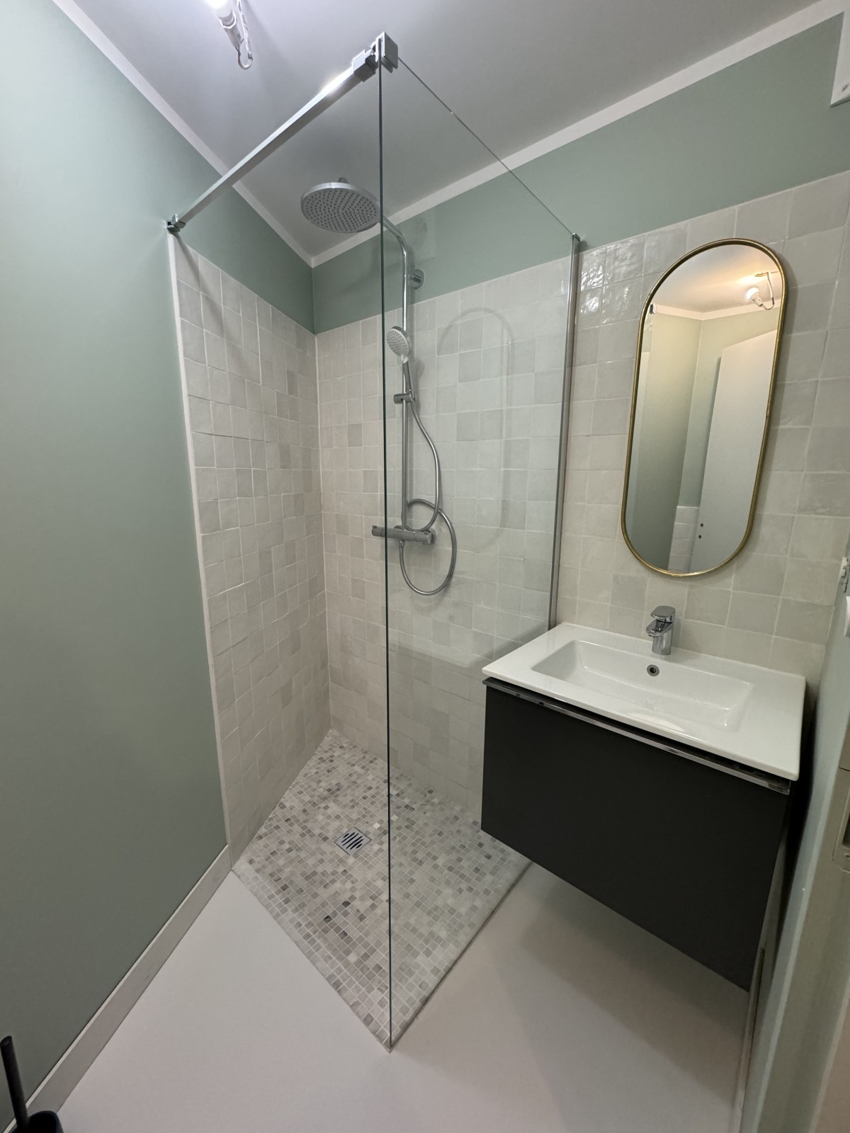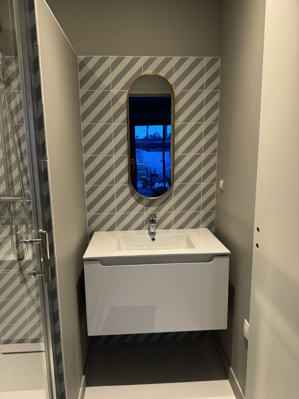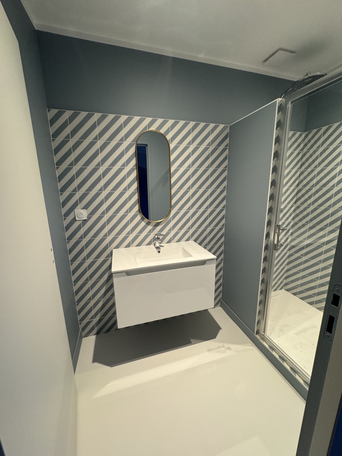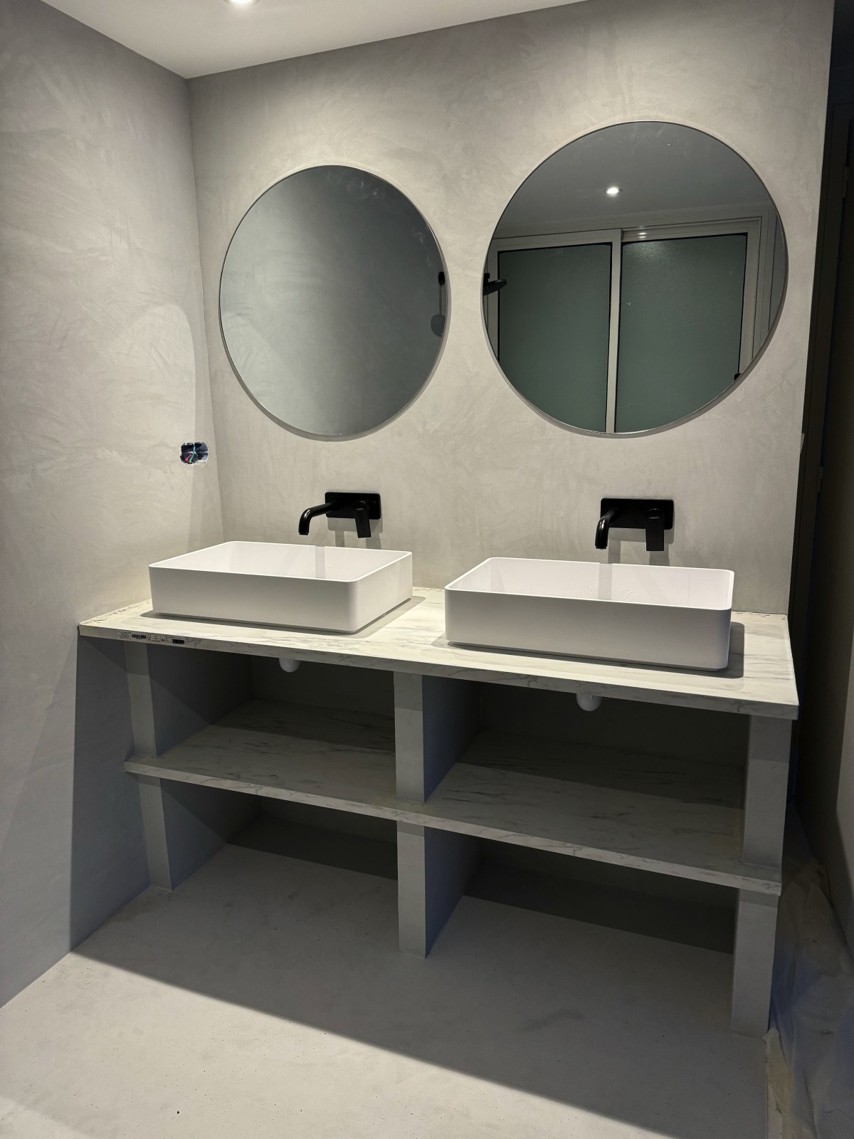 Dans cette maison, nous avons refait toutes les alimentations d’eaux , toutes les évacuations en sol et Hors sol Pour repartir sur une base saine, et ne pas avoir de problème. Nous avons effectué la pose de robinetterie encastré dans la suite parentale et de la robinetterie classique dans les autres salle d’eau. Avons posé des bacs à Douche que nous avons découpé pour être aux bonnes dimensions, et que nous avons posé directement au sol avec de la colle à carrelage spécifique pour ne pas avoir de problème. Nous avons installé des meubles suspendus dans toutes les salle d’eau, sauf la suite parentale où un immeuble a été créé par le Plaquiste qui a été enduit de béton ciré et nous avons installé des vasque à poser dessus.